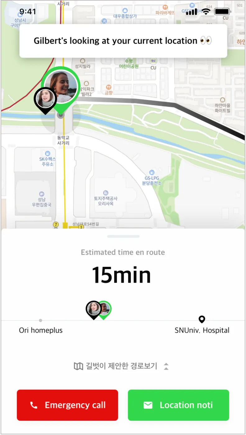 그래서 우리는 '기술을 통해 교통약자와 목적지까지 동행할 수 있는 사람을 이어주기'로 했다. 목적지와 교통 수단을 설정하면 나와 목적지가 같은 길벗을 매칭시켜주는 것이다.