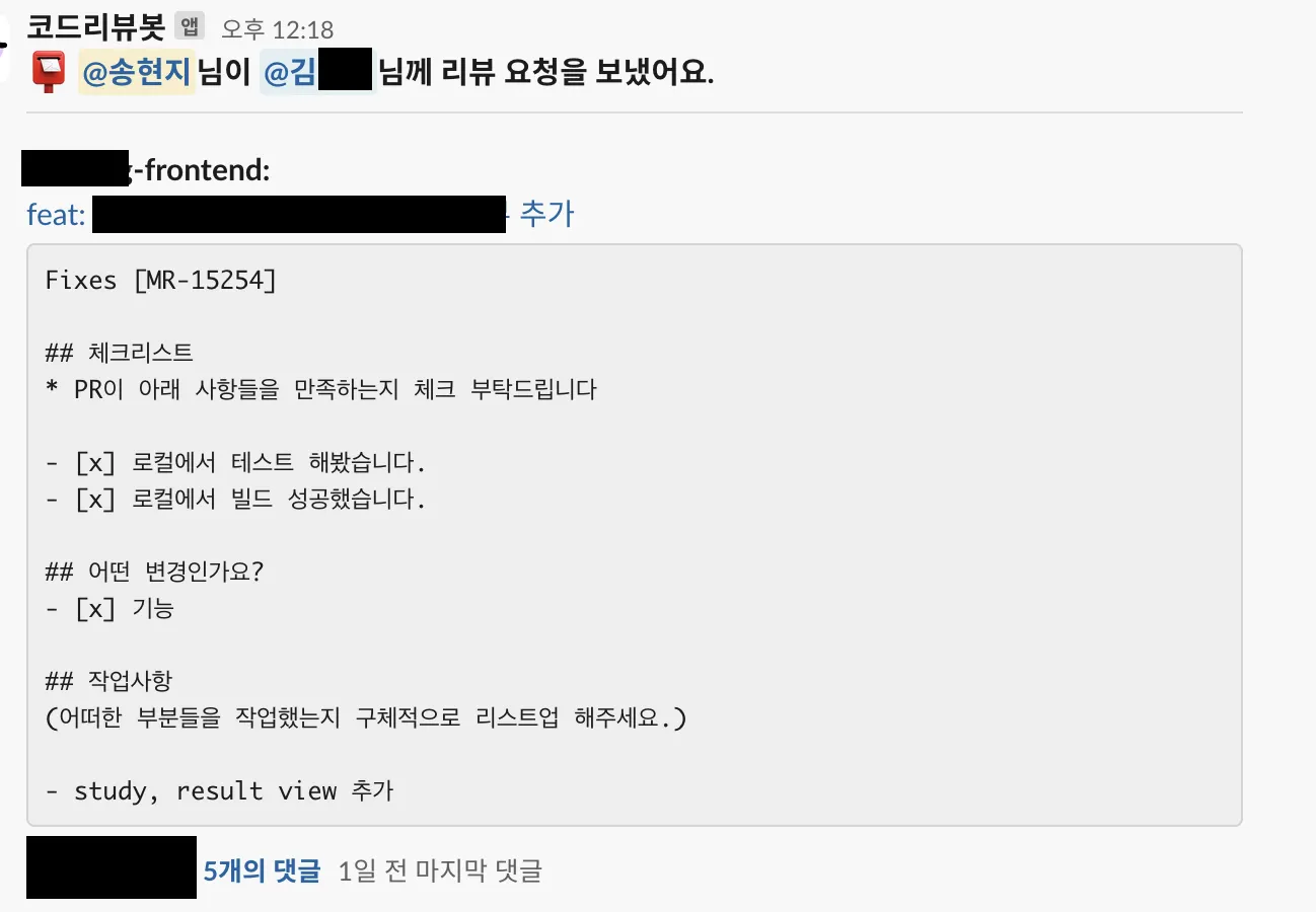 PR 오픈 시 슬랙 채널에 알림 및 멘션: "<요청자>님이 <리뷰어들>님께 리뷰를 요청했어요."