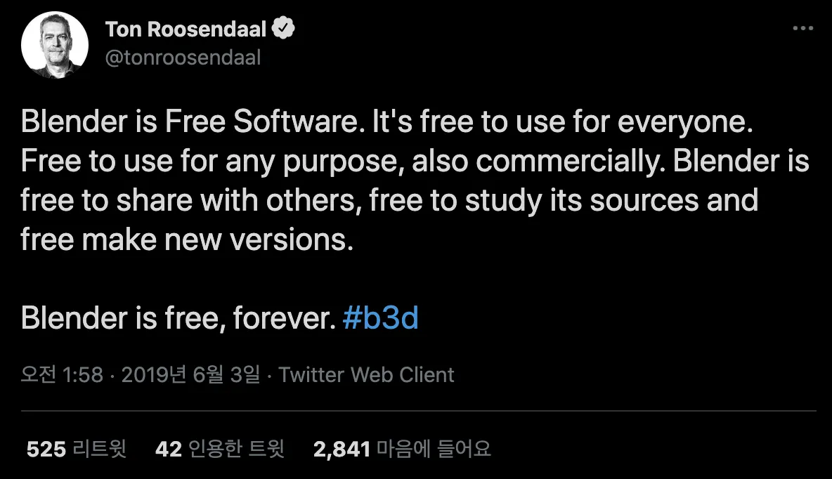 "블렌더는 무료 소프트웨어이다. 모든 사람들이 무료로 사용할 수 있다. 또한 상업적인 것을 포함해 어떤 목적에서든 자유롭게 사용될 수 있다. 블렌더는 다른 사람들과 자유롭게 공유할 수 있고, 소스 코드를 배우고, 새로운 버전을 자유롭게 만들 수 있다."