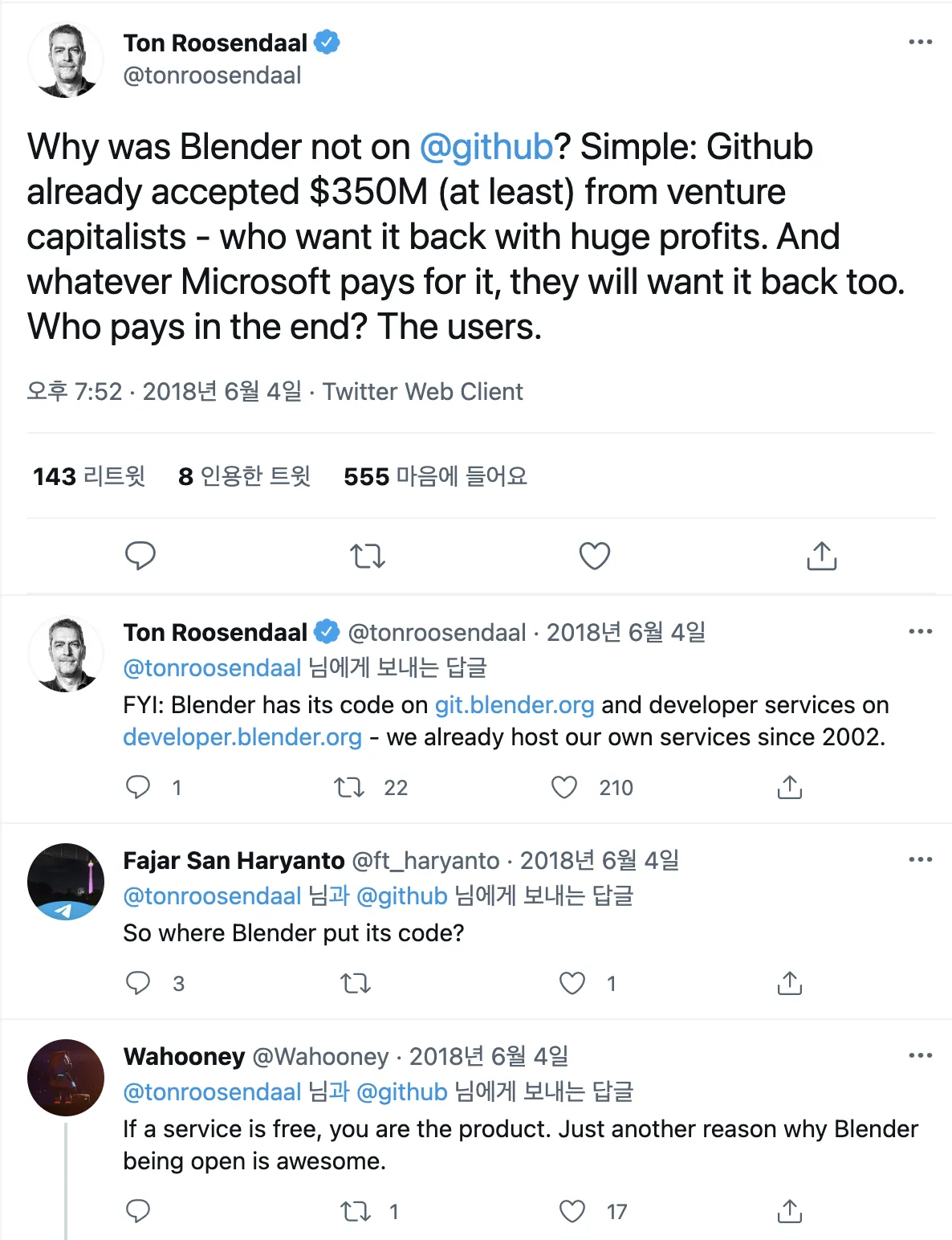 이전에 블렌더를 파면서 *GPL이라는 라이센스도 처음 알게 되었고(사실 라이센스도 거의 안씀,,) 블렌더가 깃허브에 코드를 공개하지 않는 것에 의문을 가졌다. Ton Roosendaal의 트윗을 보면 정말 선견지명이 아닐 수 없다. GPL 라이센스의 Blender가 깃허브에 코드를 올렸다면 copilot의 저작권 침해 재료로 쓰였을지도 모른다.