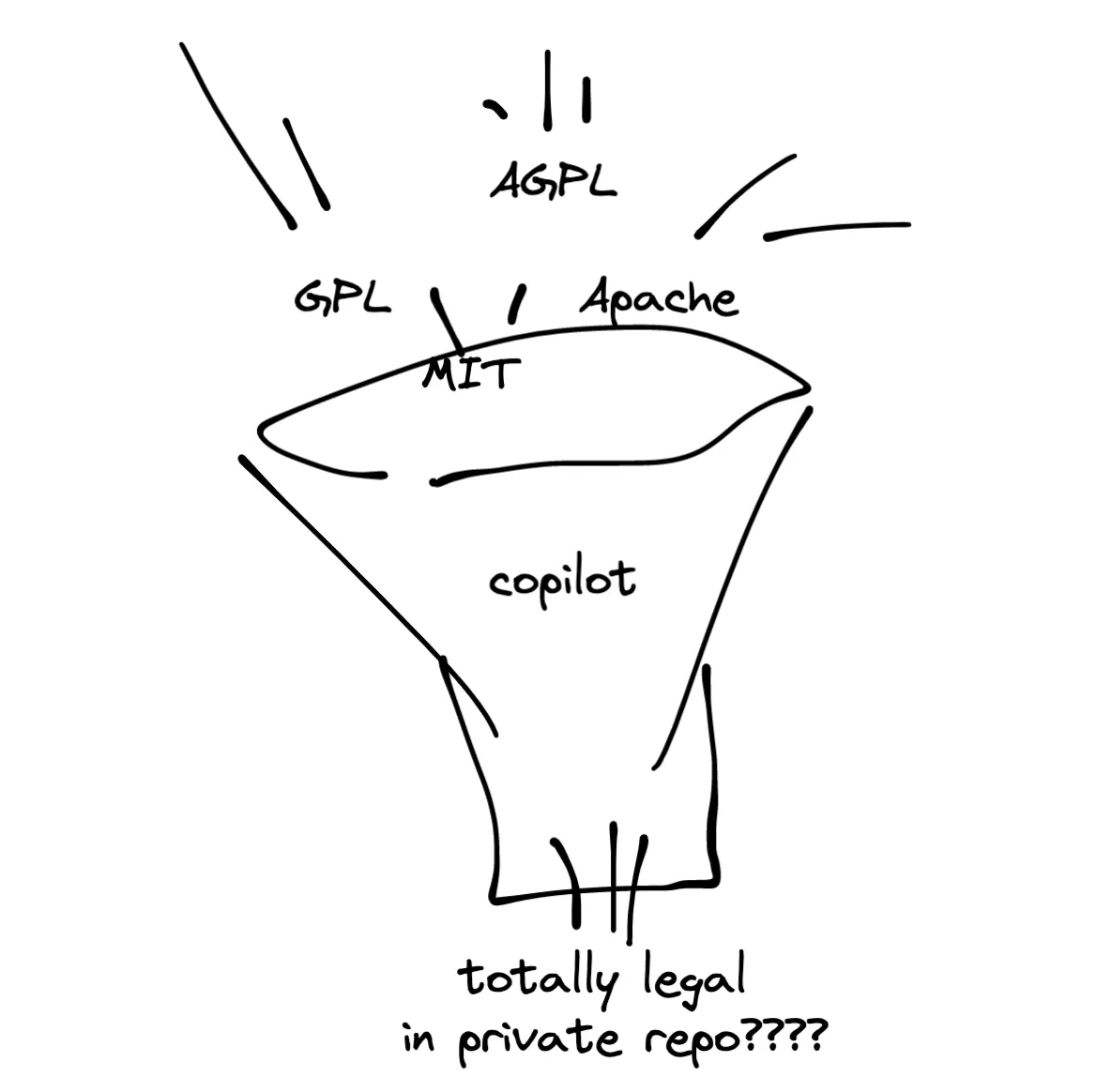 copilot은 거대한 믹서기처럼 오픈소스 코드들을 갈아넣고 새로 가공한 코드를 완전 합법인 것처럼 포장한다. 사용자가 늘어나고 카피레프트 코드에 대한 법적 침해가 인정되지 않는 사례가 늘어나면 라이센스가 무슨 의미가 있을까.
