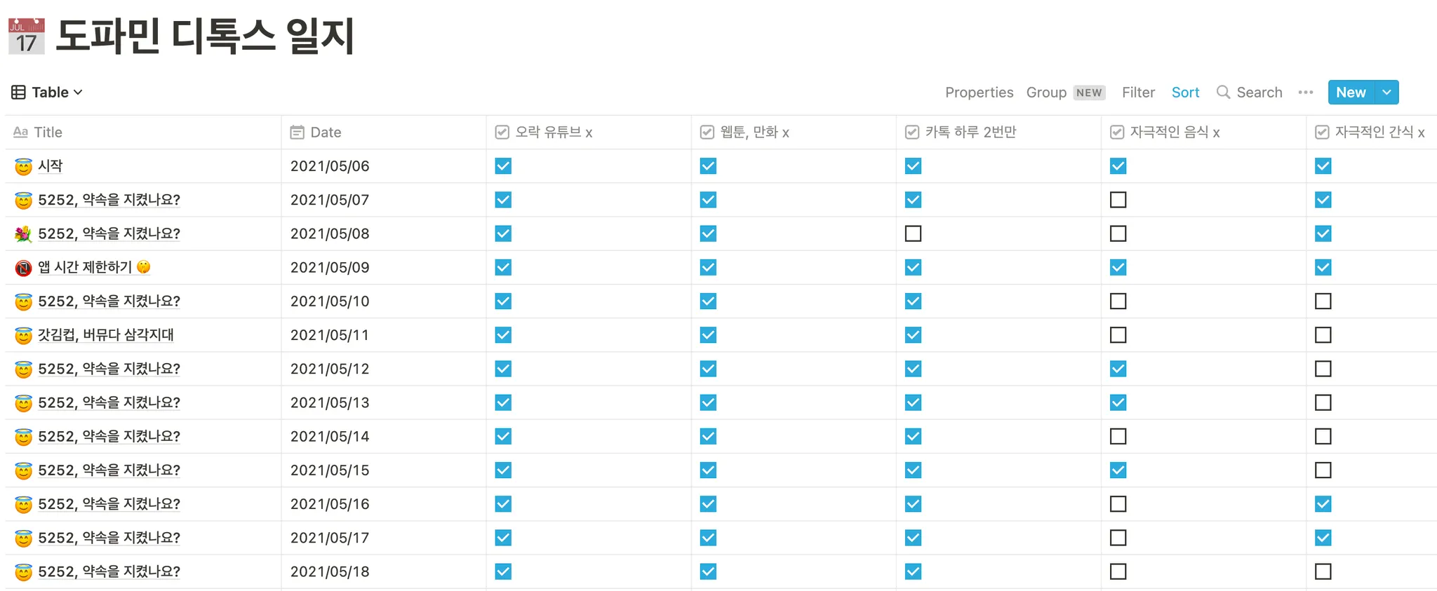 중독을 없애기 위해 작성한 도파민 디톡스 일지. 다른 건 다 참아도 맛있는 음식은 못 참았다.