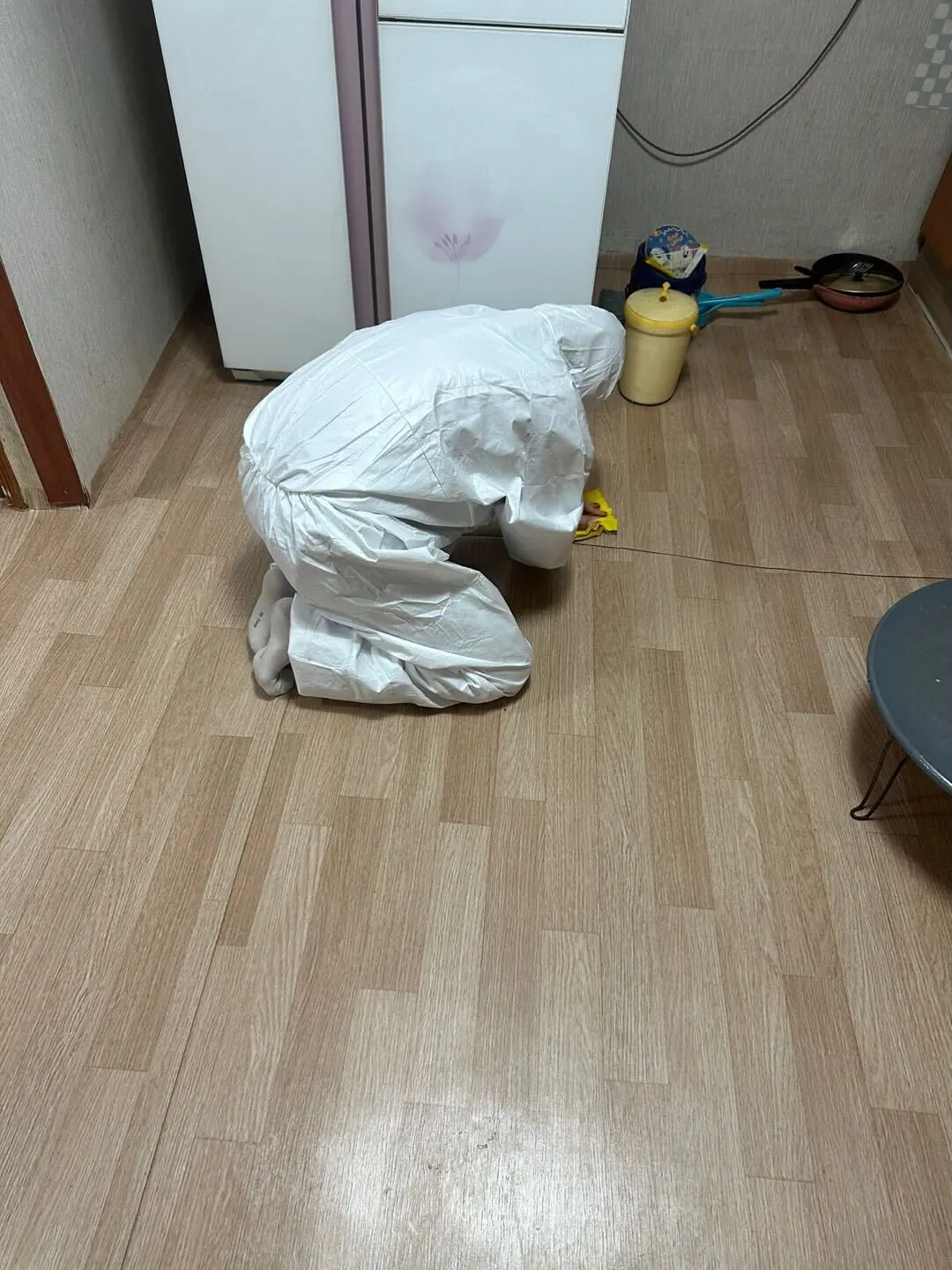 저기 스펀지맨처럼 방진복 입고 있는 사람이 나다. 도배하면 옷에 풀 많이 묻는다고 해서 가져 왔는데 나만 챙김 ㅋㅋ