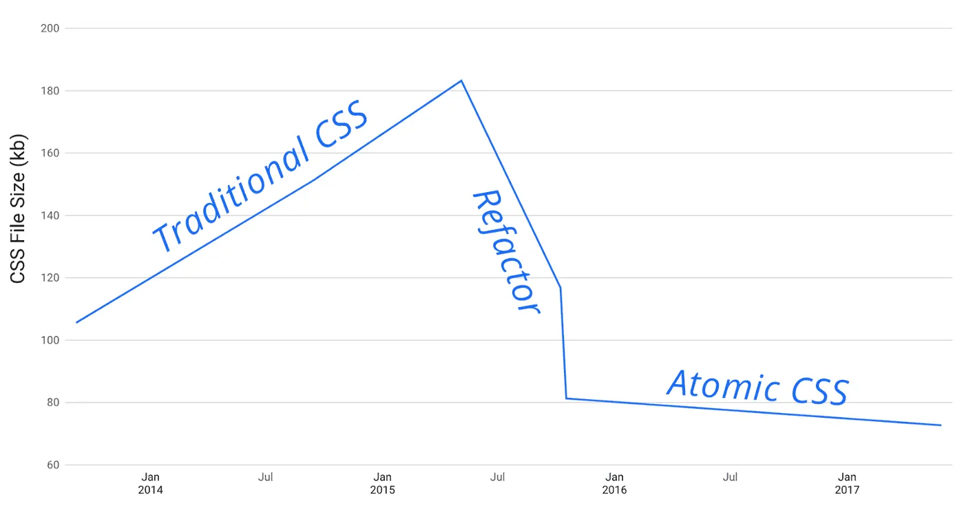 또한 atomic css의 가장 좋은 점은 미리 만들어놓은 클래스들이 있으면 새로운 컴포넌트를 만들 때에도 기존의 스타일을 사용하면 된다는 것이다. 따라서, 새로 추가되는 css는 없고 기존 것만 사용하여 개발을 더 쉽고 빠르게 할 수 있다.