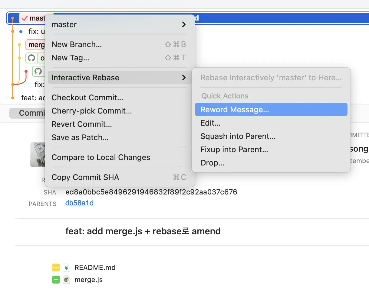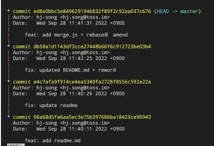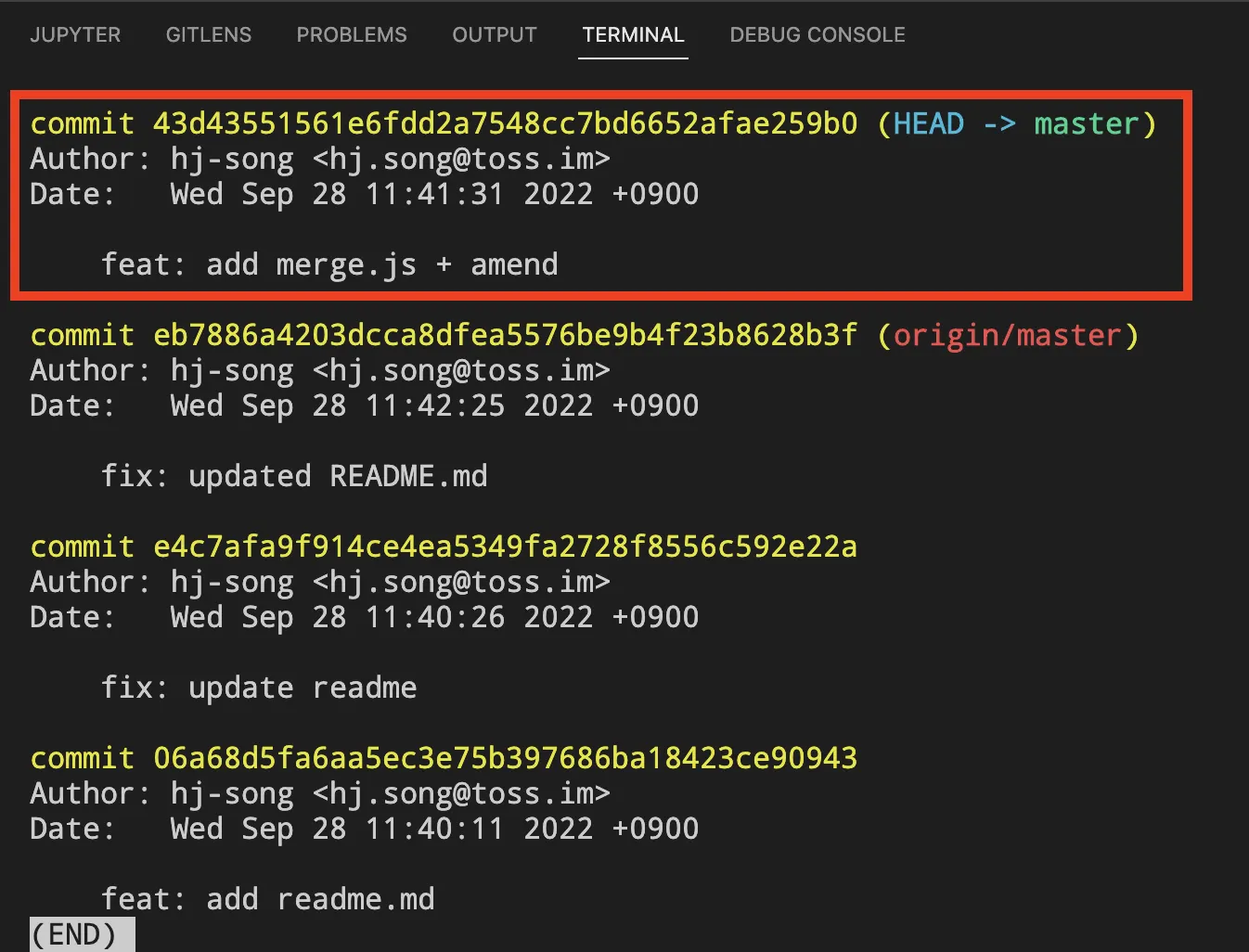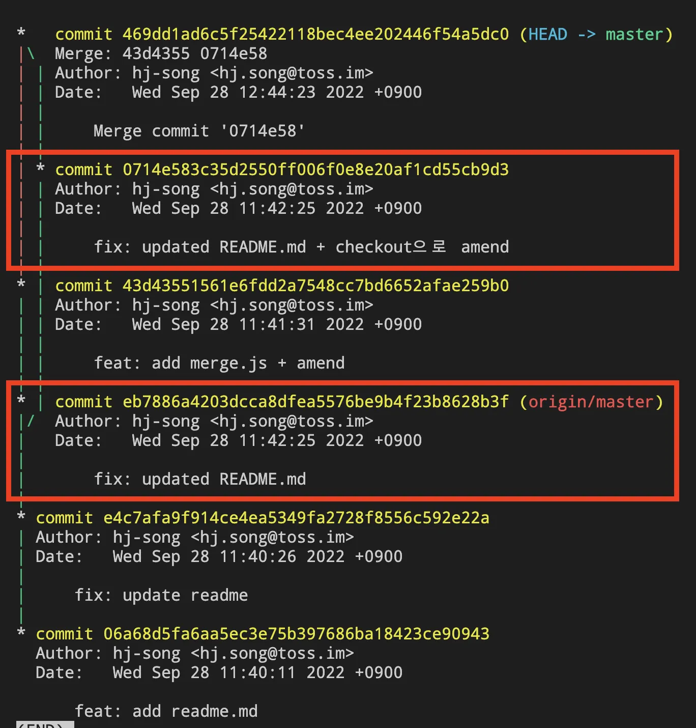 주목할 것은 기존 add merge.js 커밋의 해시와 바뀐 커밋의 해시가 다르다는 점. 즉, 기존 커밋이 유지되는 게 아니라 새로운 커밋으로 바뀐다는 것입니다.