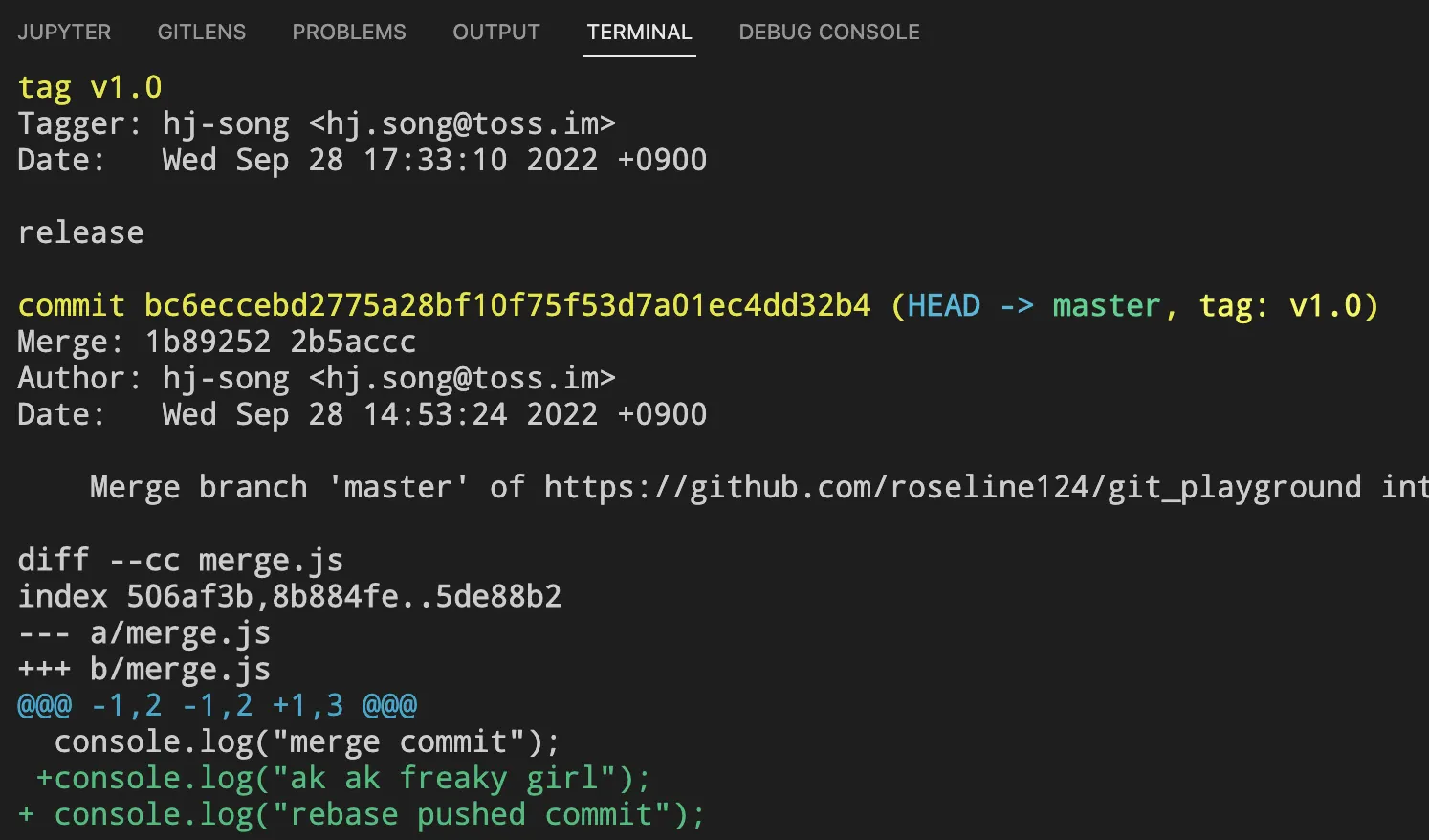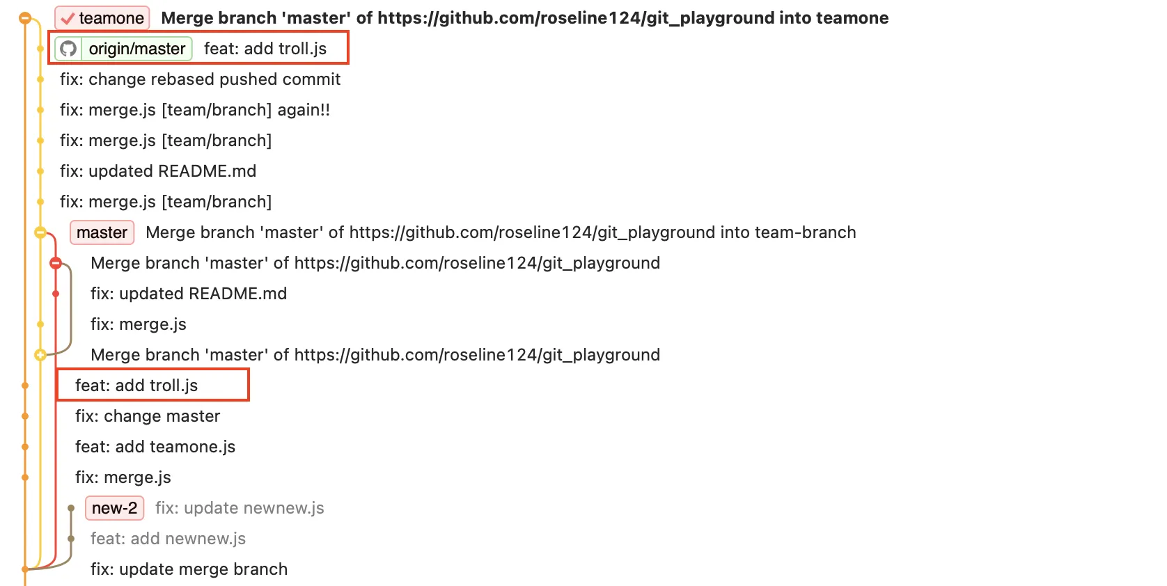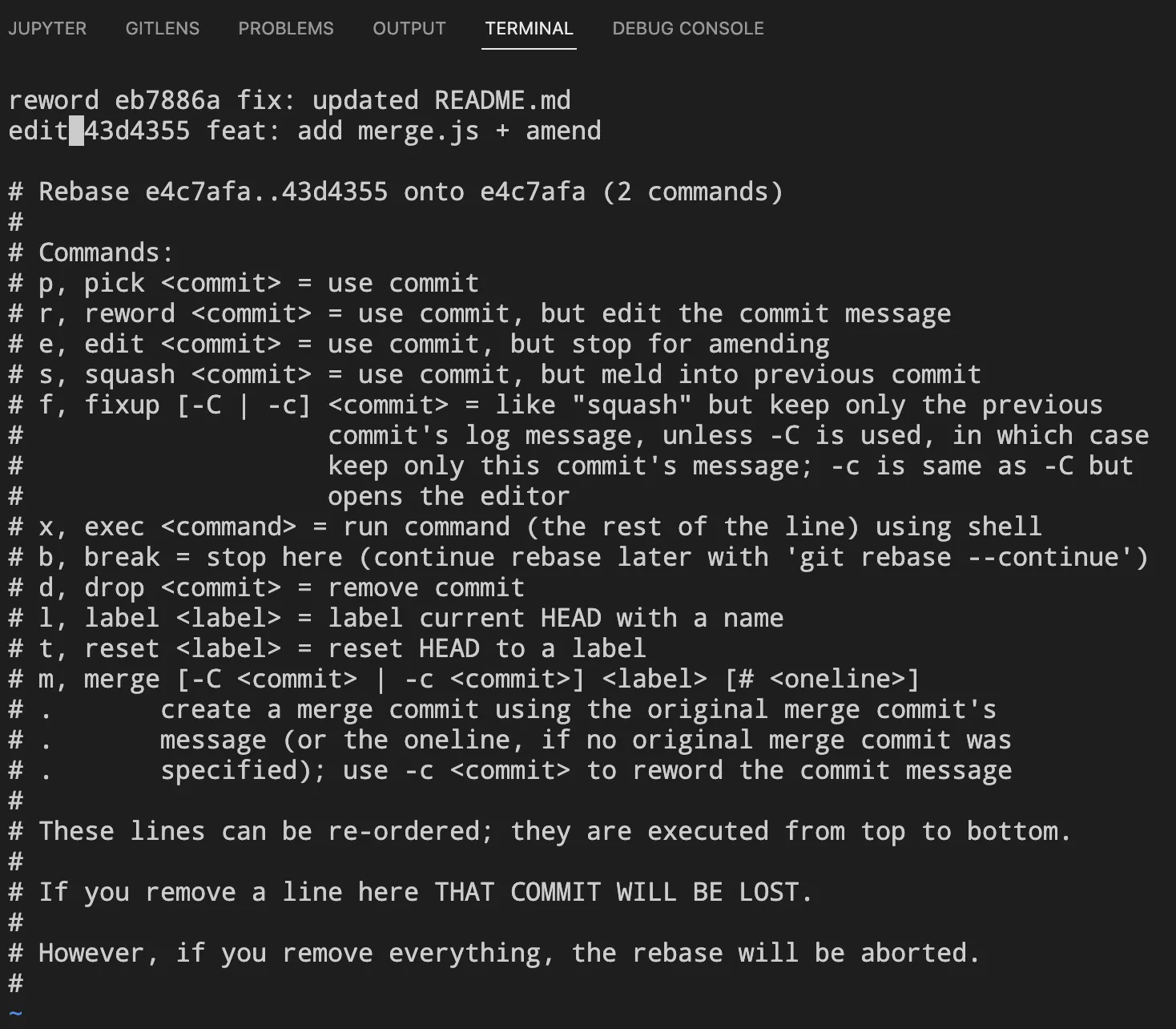 주목할 것은 기존 add merge.js 커밋의 해시와 바뀐 커밋의 해시가 다르다는 점. 즉, 기존 커밋이 유지되는 게 아니라 새로운 커밋으로 바뀐다는 것입니다.