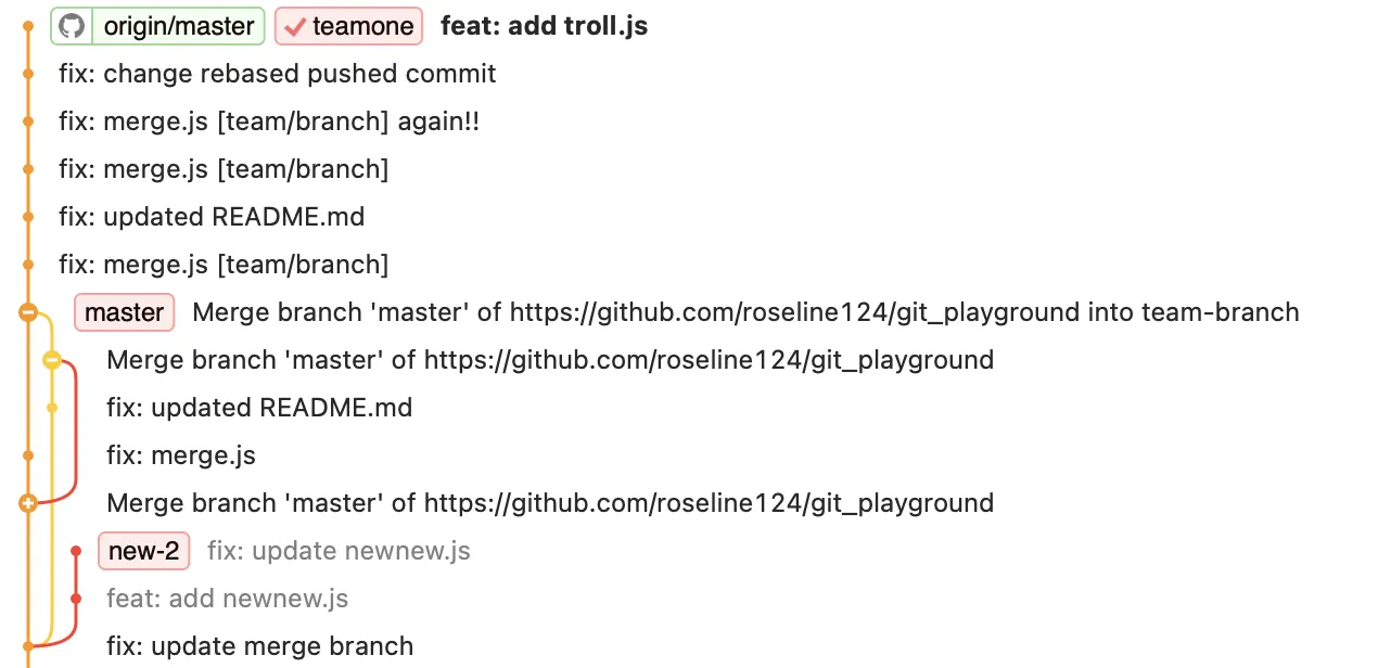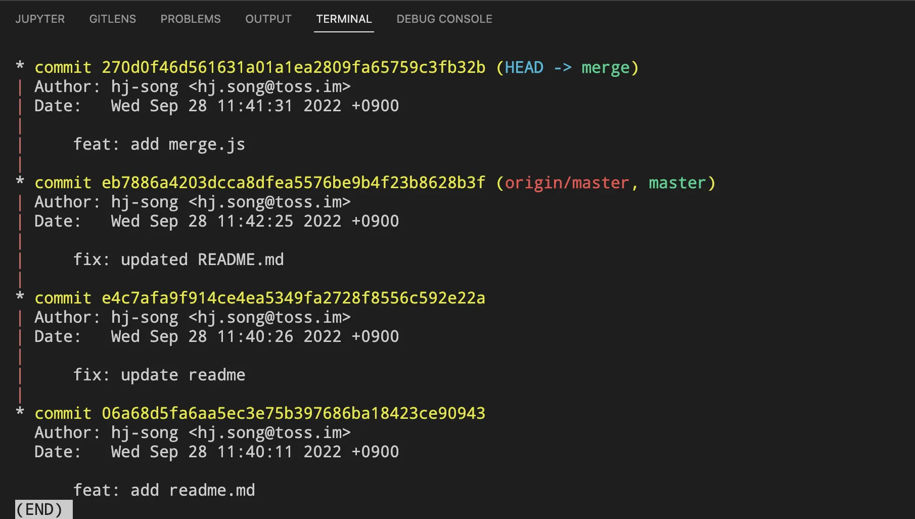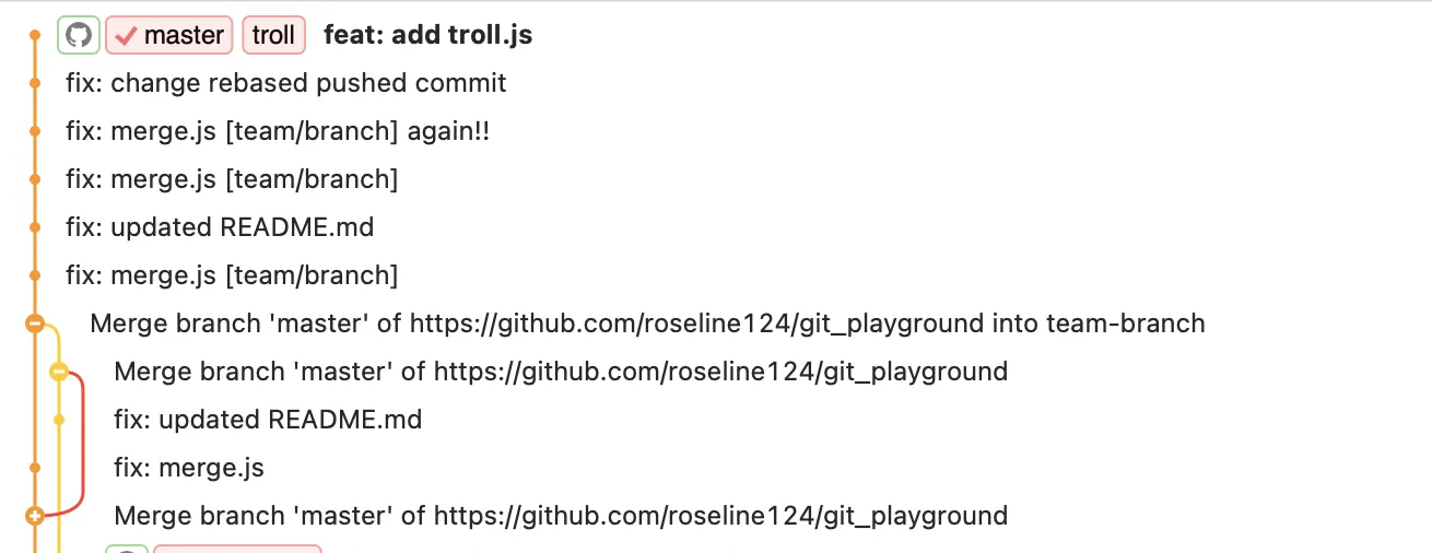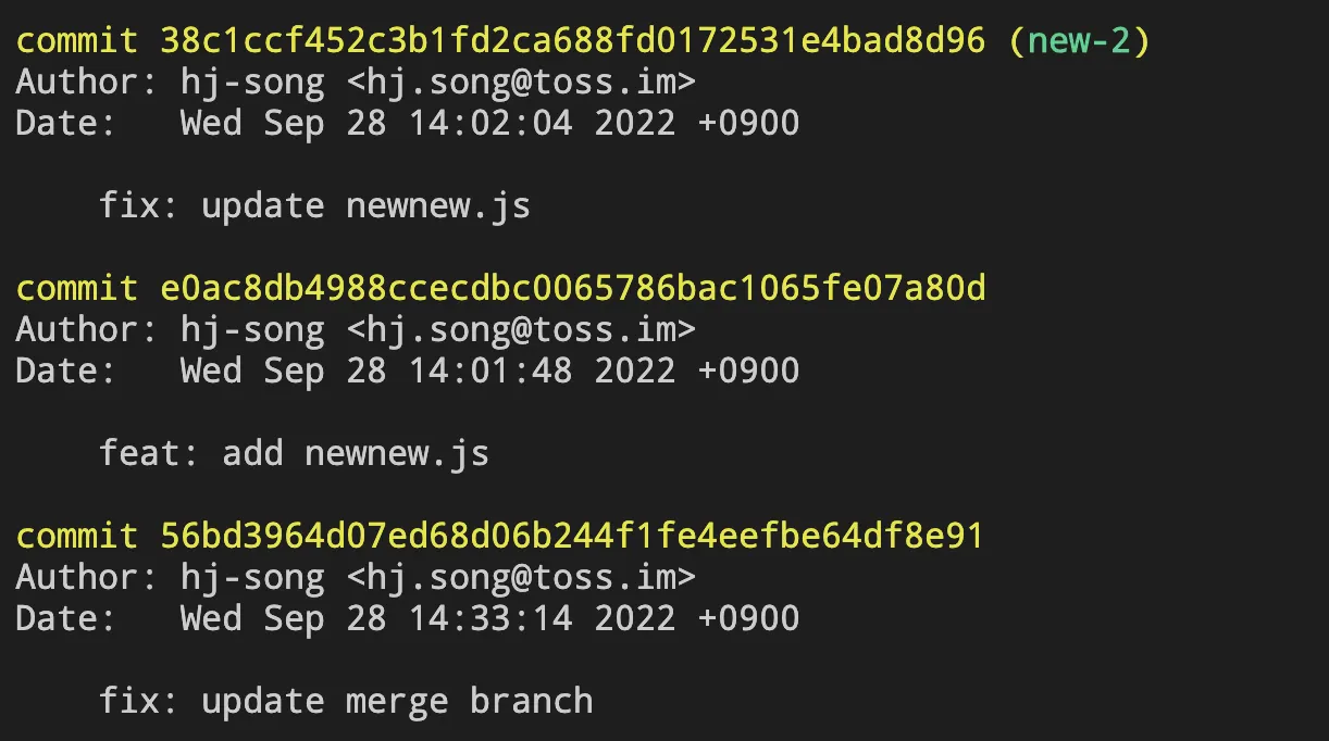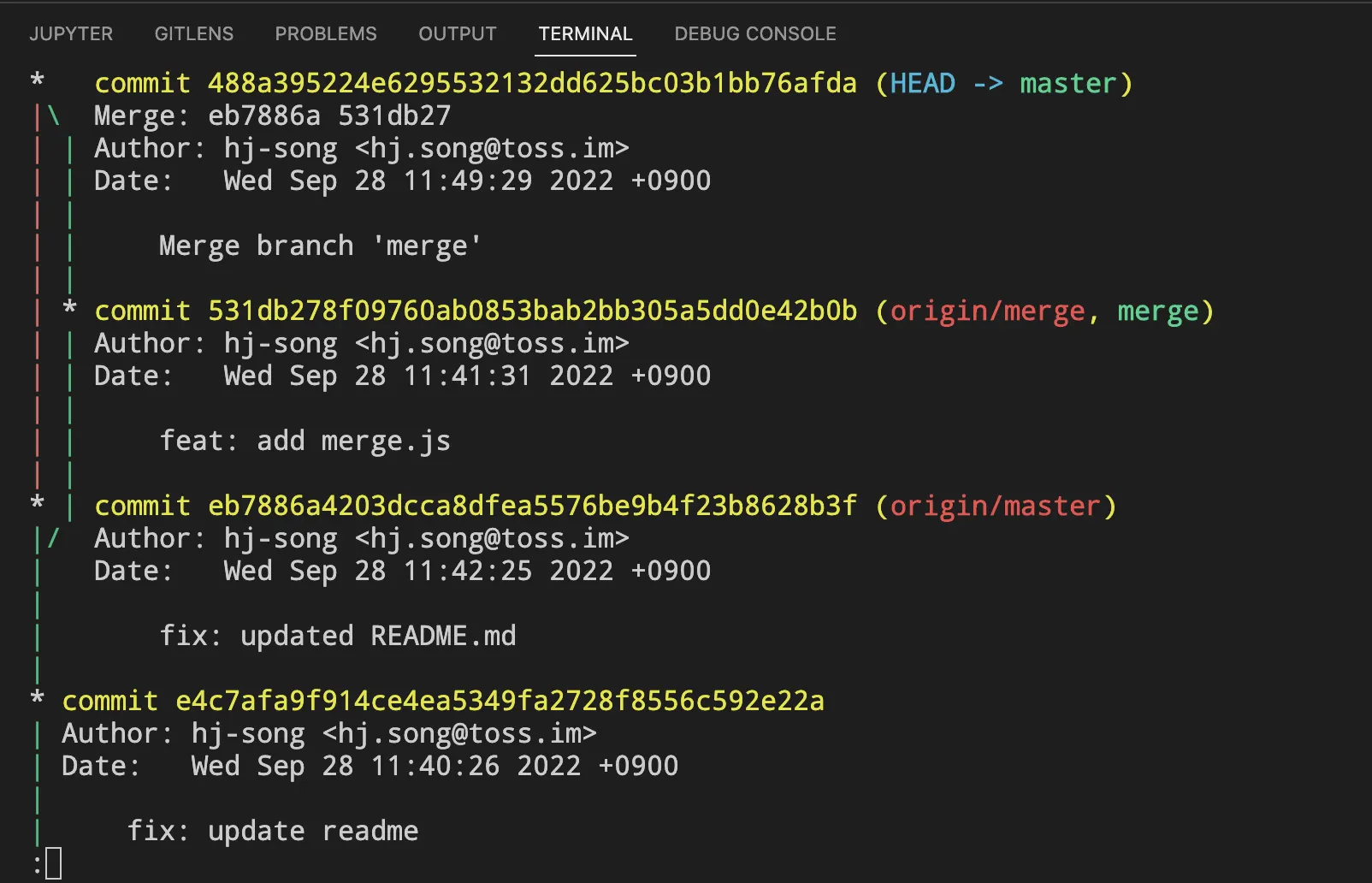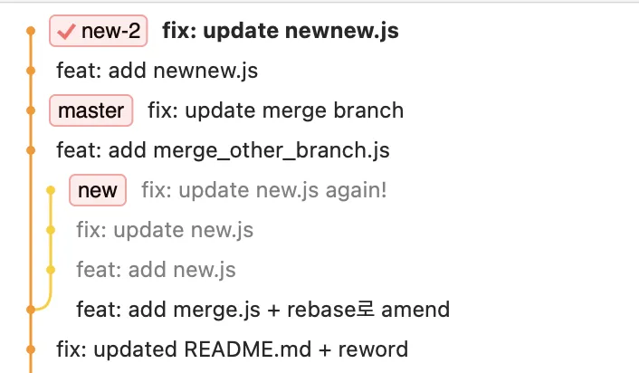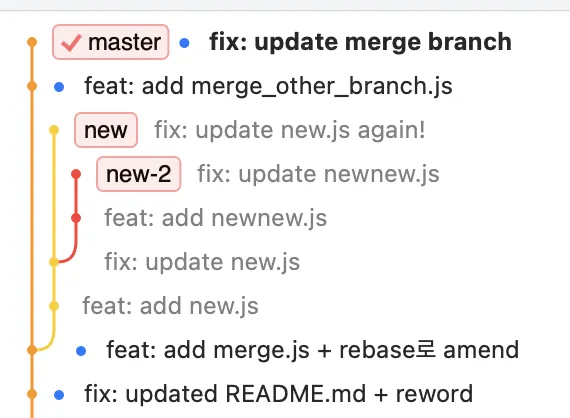 완료 이후의 git log입니다. checkout 때와 달리 기존 branch가 변경 전과 똑같이 유지됩니다.