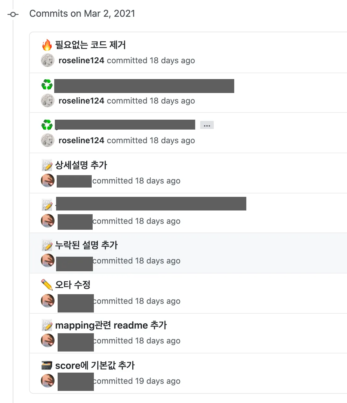 커밋 로그 맨 처음에 이모지를 사용해 커밋 로그를 직관적으로 바꾼다. 처음에 깃모지가 나왔을 때는 너무 산만해보여서 좋은 커밋 메시지 작성법을 참고해 [Fix], [Feat], [Chore] 등 prefix를 앞에 붙여 사용했다.