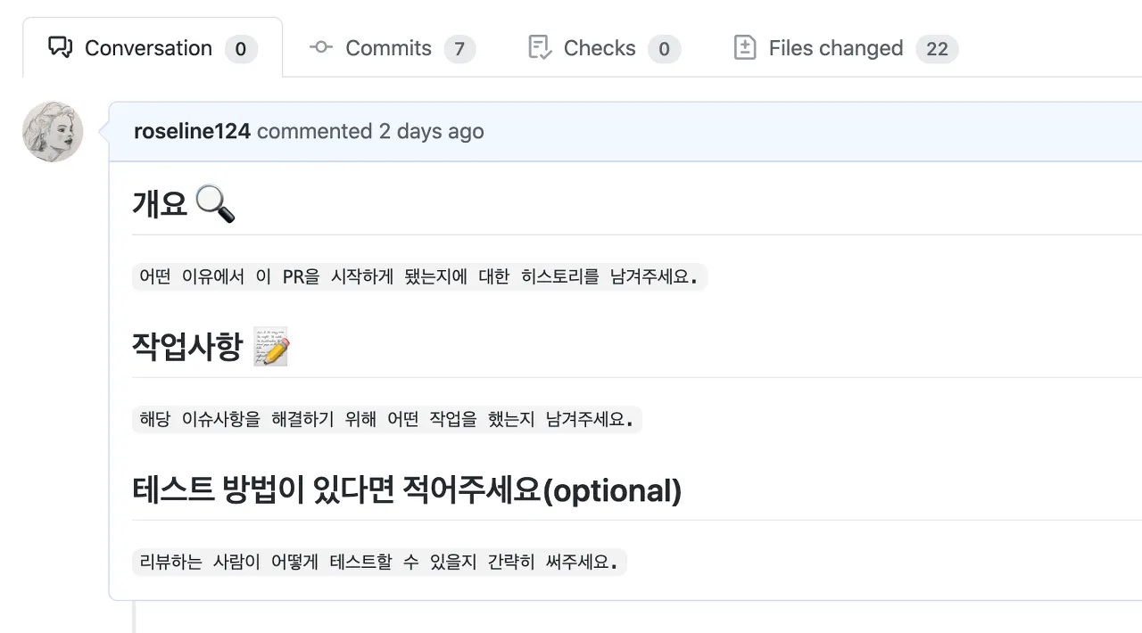 pr을 날리면 아래처럼 템플릿이 적용된다.