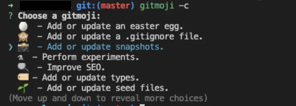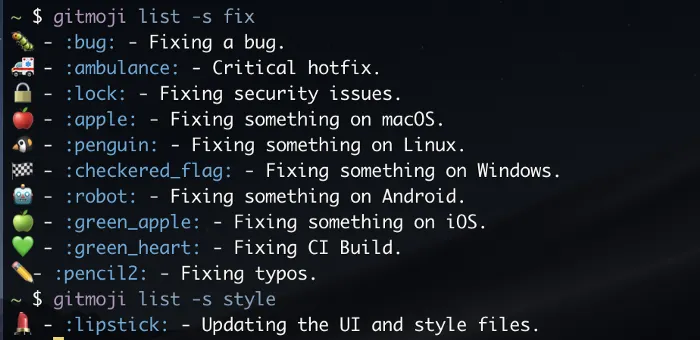 반면, gitmoji의 경우 설치해서 gitmoji -c 명령어를 사용하면 프롬프트에서 커밋 성격에 맞는 이모지를 고를 수 있다.