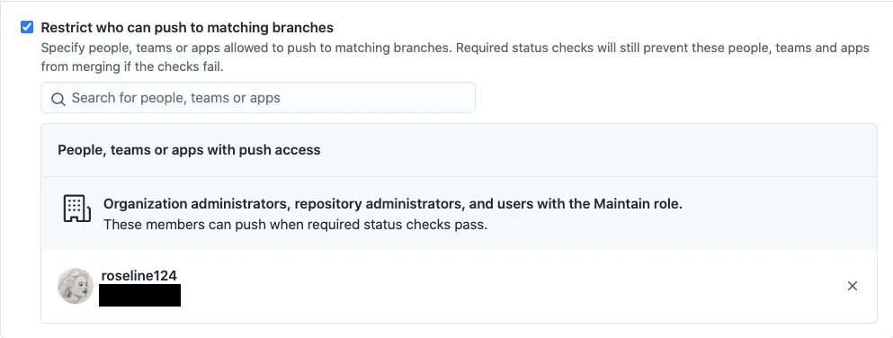 위의 설정은 master 브랜치에 실수로 푸시하는 일이 없도록 푸시할 수 있는 팀원들을 제한한다. 팀에 들어오지 얼마 안된 뉴비분들이 실수로 마스터 브랜치에 푸시하는 일을 예방할 수 있다.