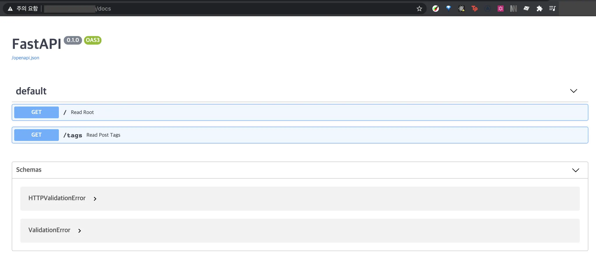 <domain>/docs 에서 자동으로 생성된 api document를 확인할 수 있다.