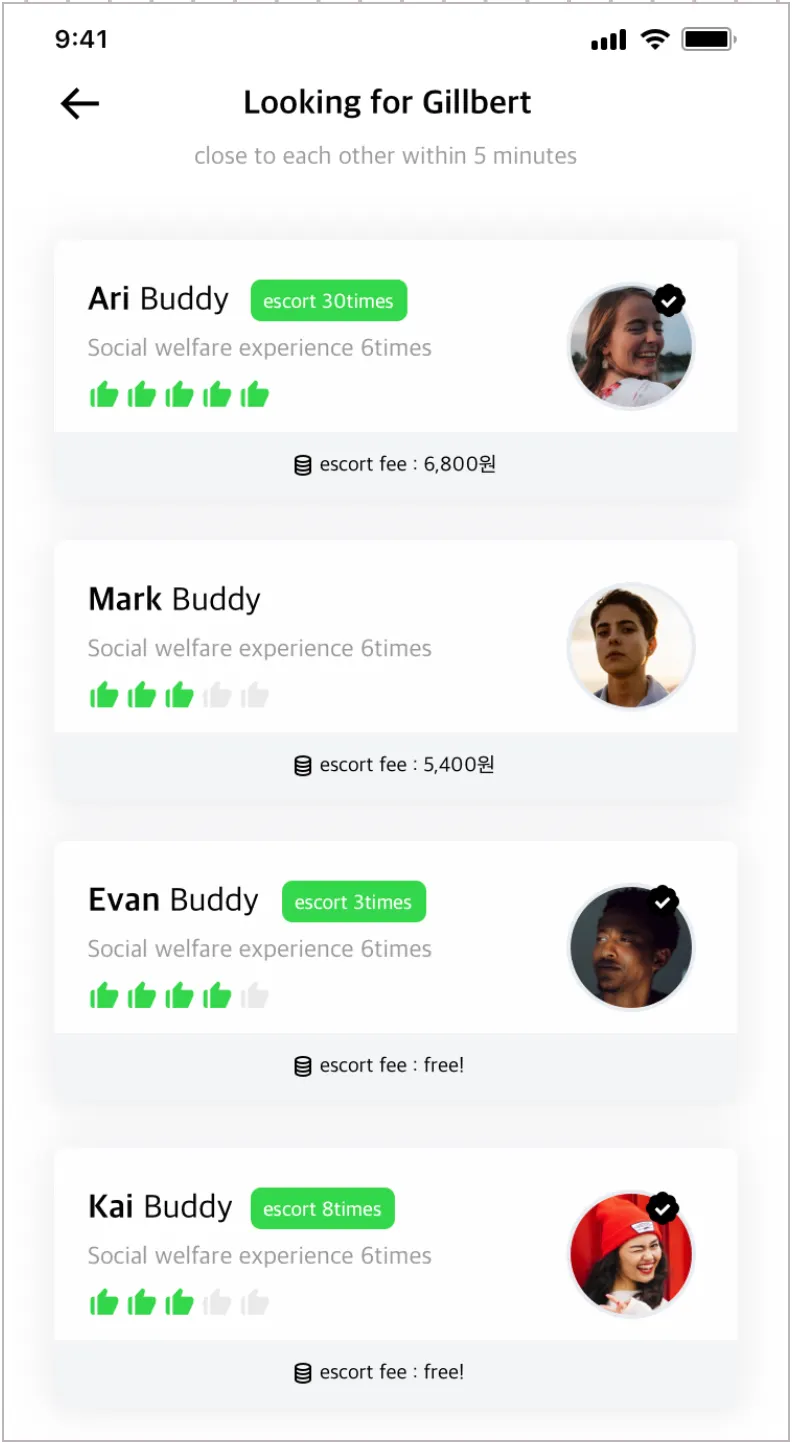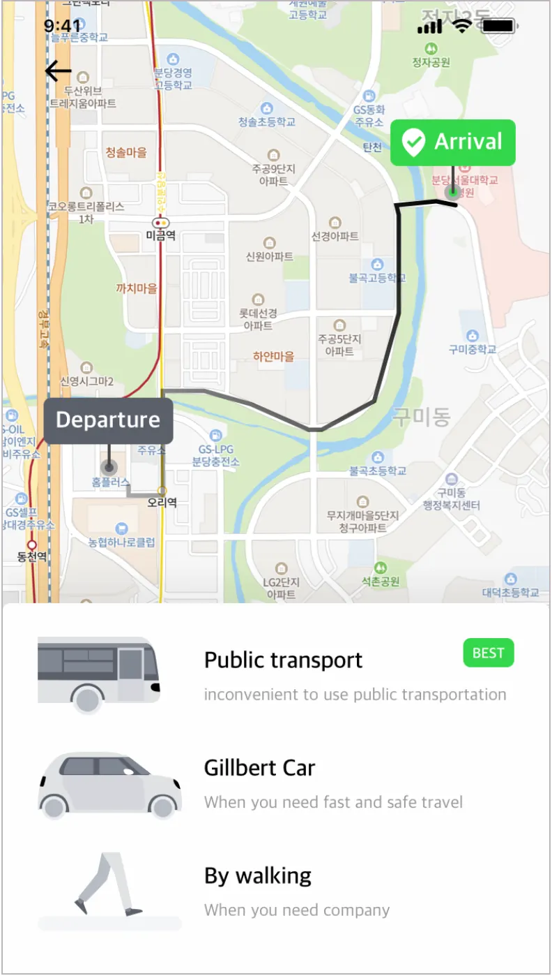 그래서 우리는 '기술을 통해 교통약자와 목적지까지 동행할 수 있는 사람을 이어주기'로 했다. 목적지와 교통 수단을 설정하면 나와 목적지가 같은 길벗을 매칭시켜주는 것이다.