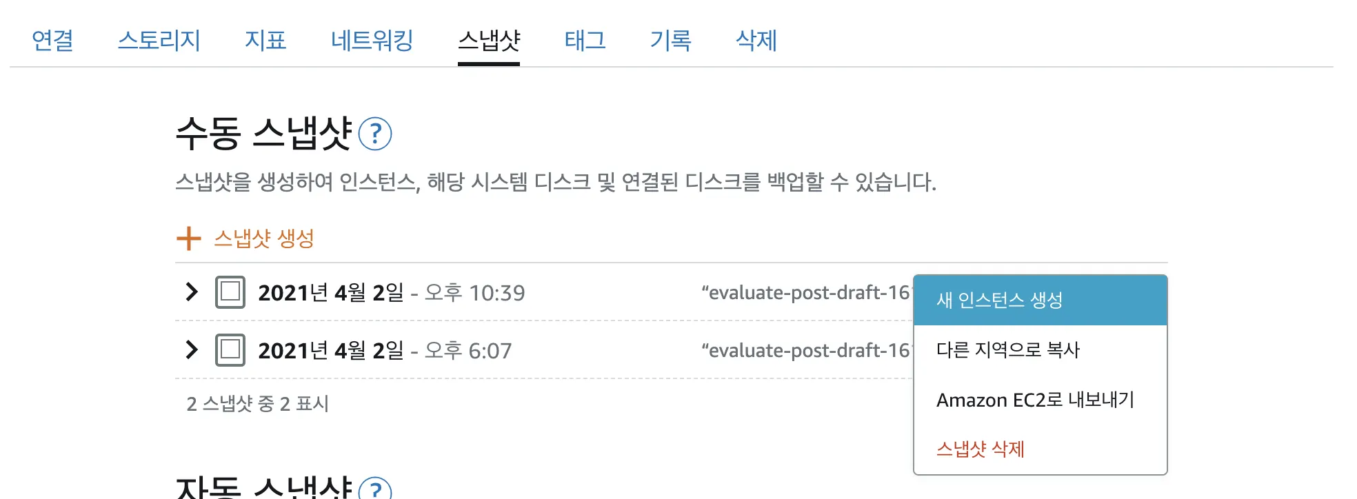 만약 기존에 생성한 인스턴스의 플랜을 바꾸려면 스냅샷을 생성한 후, 인스턴스를 새로 생성한다.