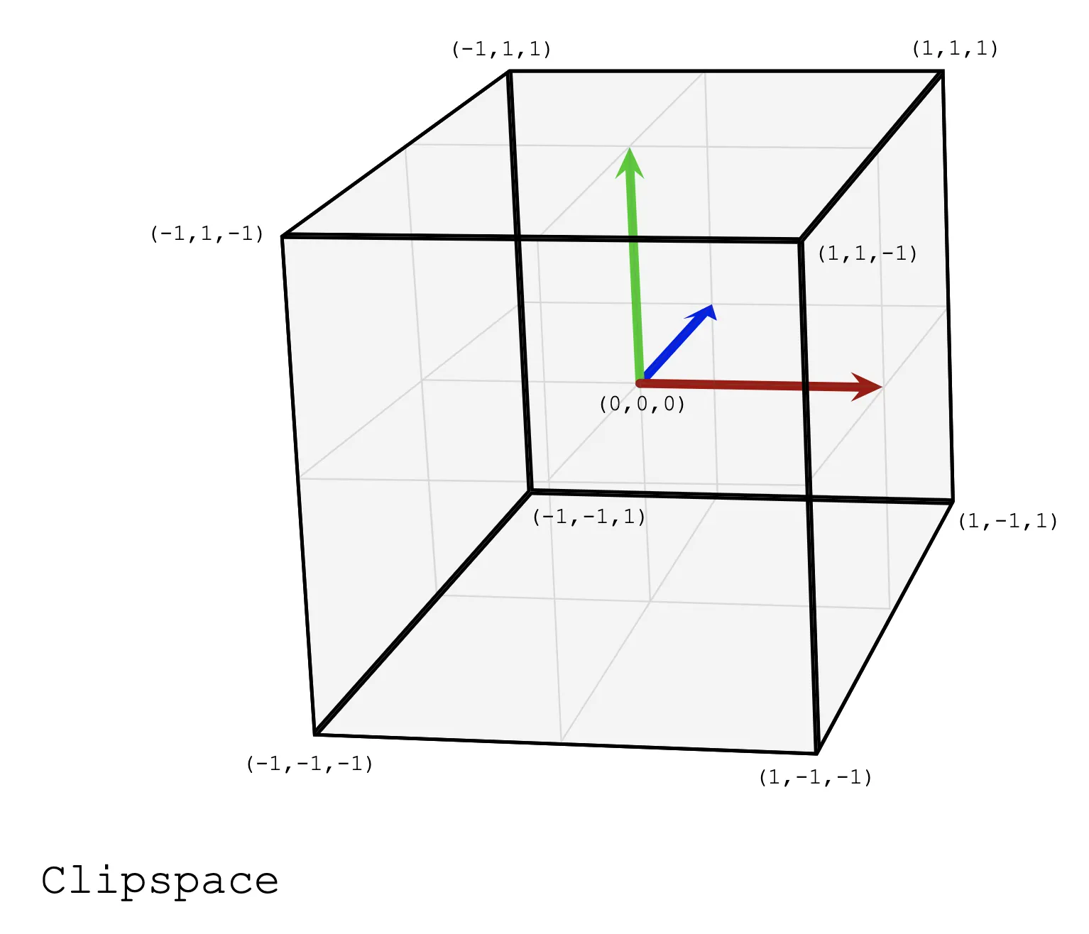 WebGL에서는 데이터를 일반 좌표계로 GPU에 업로드 한 다음, vertex shader로 clip space라는 특수한 좌표계로 전환한다. triangle은 clip space 내에서만 렌더링될 수 있으며, clip space를 벗어나면 벗어난 부분만 잘리게 된다. 클립 공간에서 사용하는 이러한 *입방 미터 좌표계를 NDC(normalized device coordinates)라고 한다. Z 값이 작을 수록, 즉 더 앞에 놓여져있을 수록 더 위에 놓여지게 된다. (z-index와 같은 개념이다.)