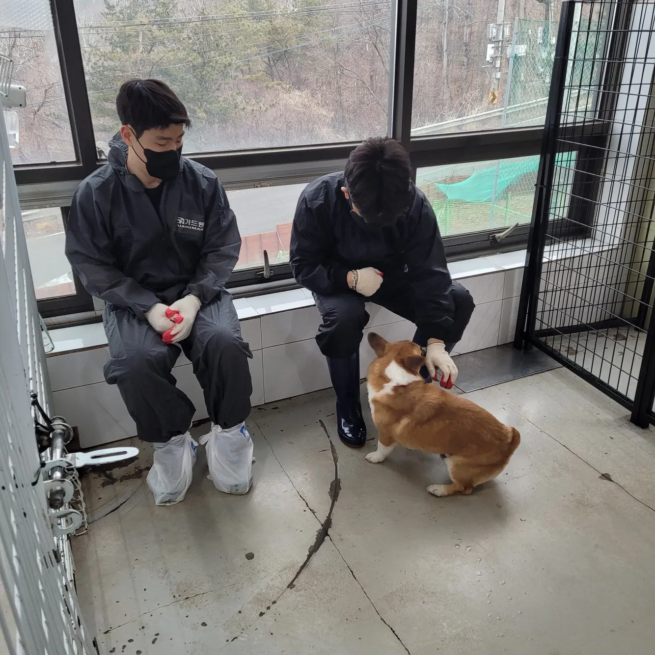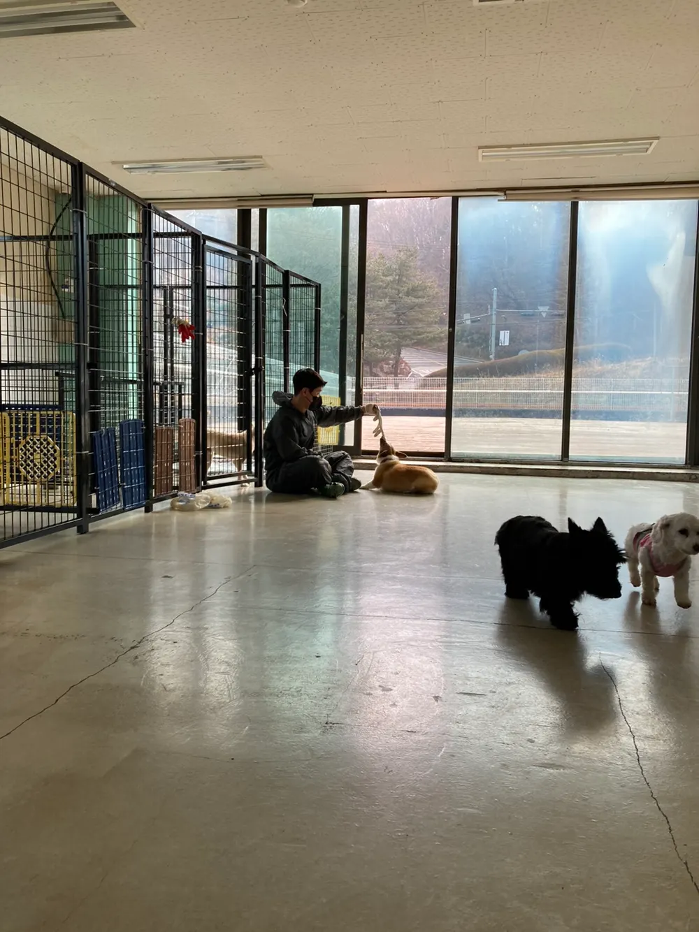 할 일이 모두 끝나면 다같이 앉아서 강아지들과 노는 시간을 가진다.